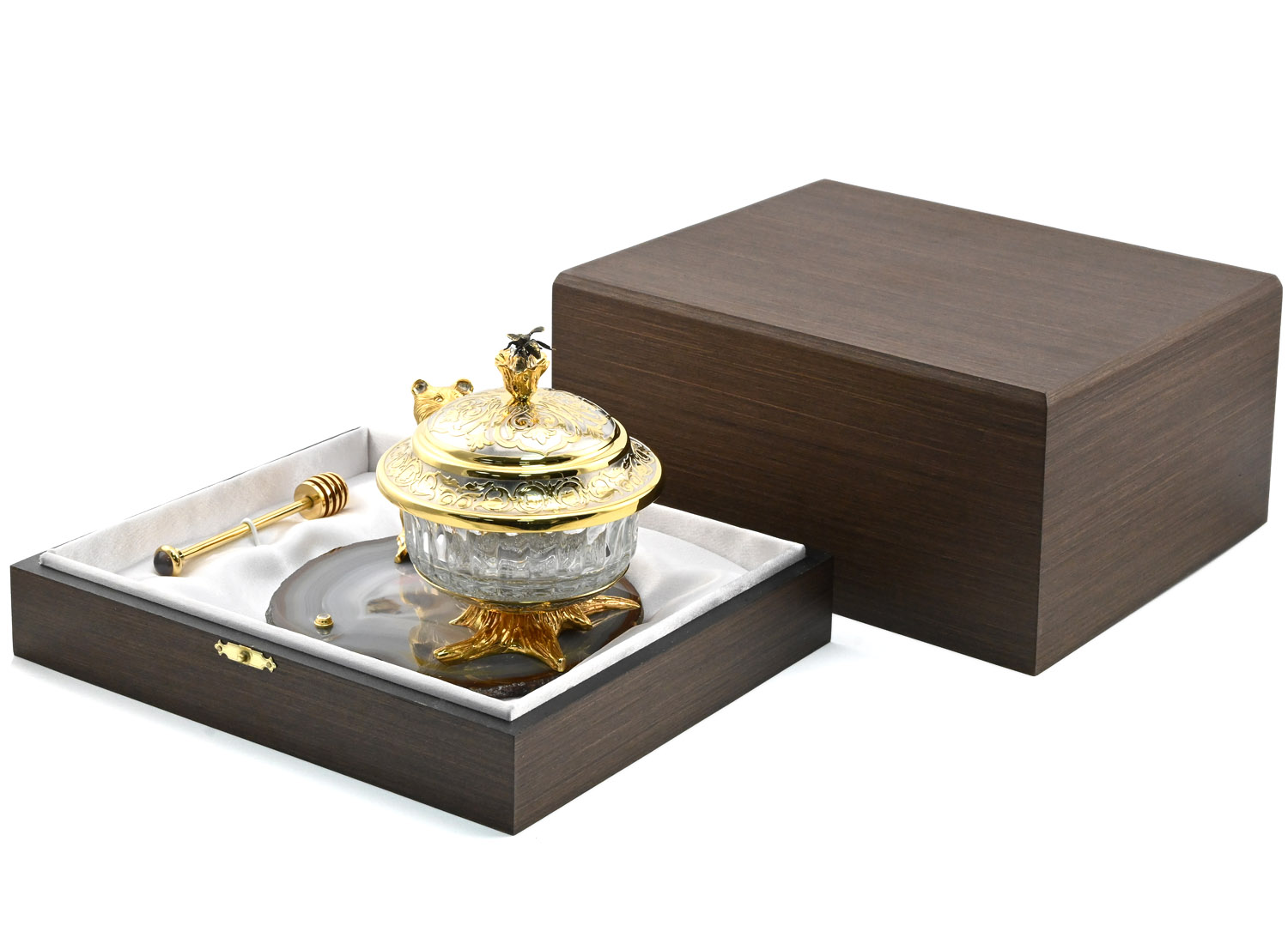 Элегантная и роскошная медовница "Медвежонок" станет прекрасным подарком для ценителей изысканных вещей. Изделие сочетает в себе традиционные техники ювелирного искусства и современный дизайн, создавая неповторимый образ.