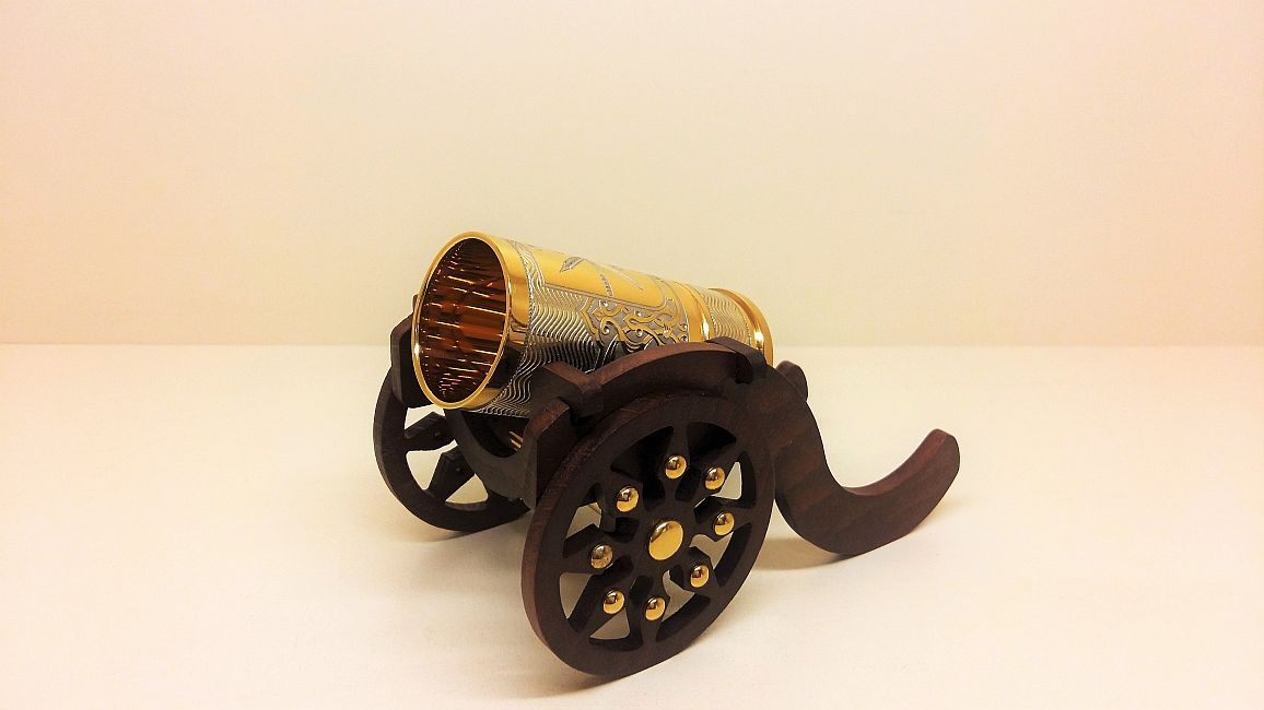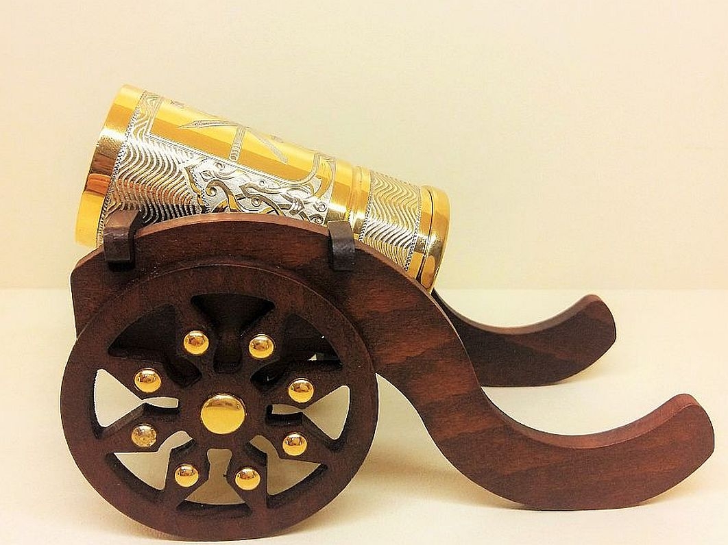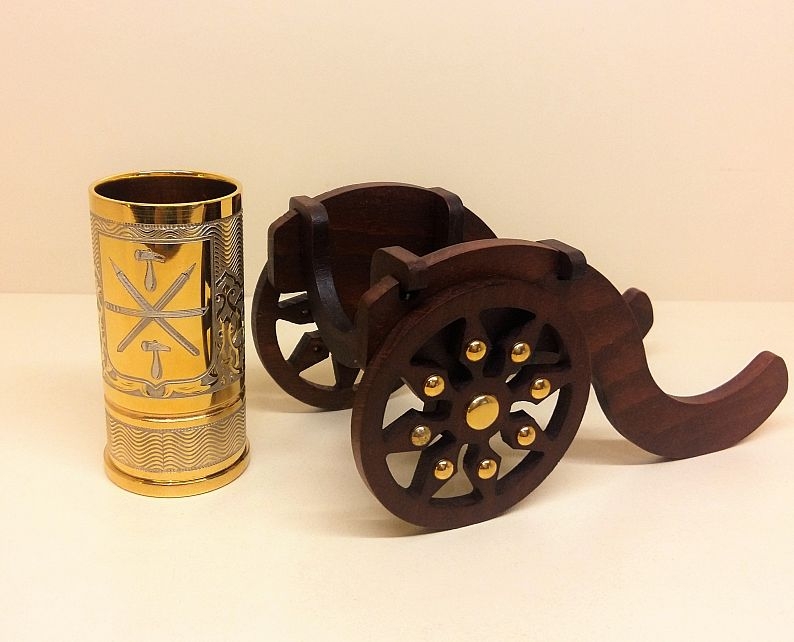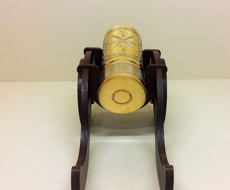Этот подарок оценил бы сам царь Петр I, собиравший пушки. Коллекцию элитных подарков для коллег, руководителей и бизнес-партнеров пополнила эта чудесная новинка-эксклюзив от мастеров Златоуста. Именно они являются поставщиками посуды и элементов декора для Кремля - главной резиденции России. Водочный набор "Пушка" с гербом Тулы Златоуст - это одновременно элемент декора и посуда. Стопка для водки имитирует ствол пушки и устанавливается на лафет.