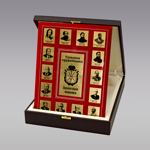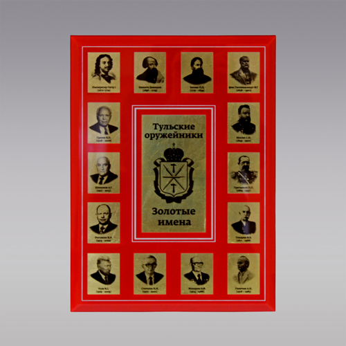 В салоне подарков "Эго Арт" всегда в наличии стильные интерьерные аксессуары ручной работы, предназначенные для дарения по случаю профессиональных праздников. Новинка ассортимента, авторское панно «Тульские оружейники. Золотые имена» выполнено из качественных, дорогостоящих материалов. Оно прекрасно дополнит рабочий кабинет, подчеркнет статус его хозяина. Изделие комплектуется сертификатом подлинности и кратким жизнеописанием выдающихся тульских оружейников.